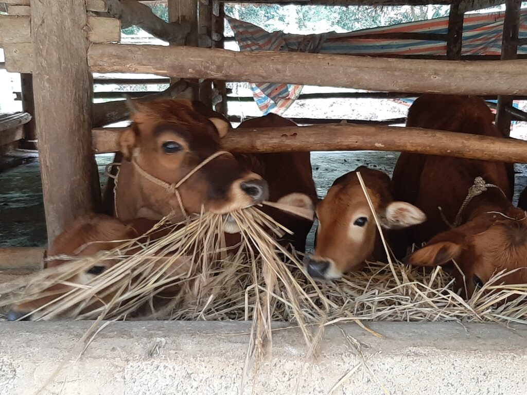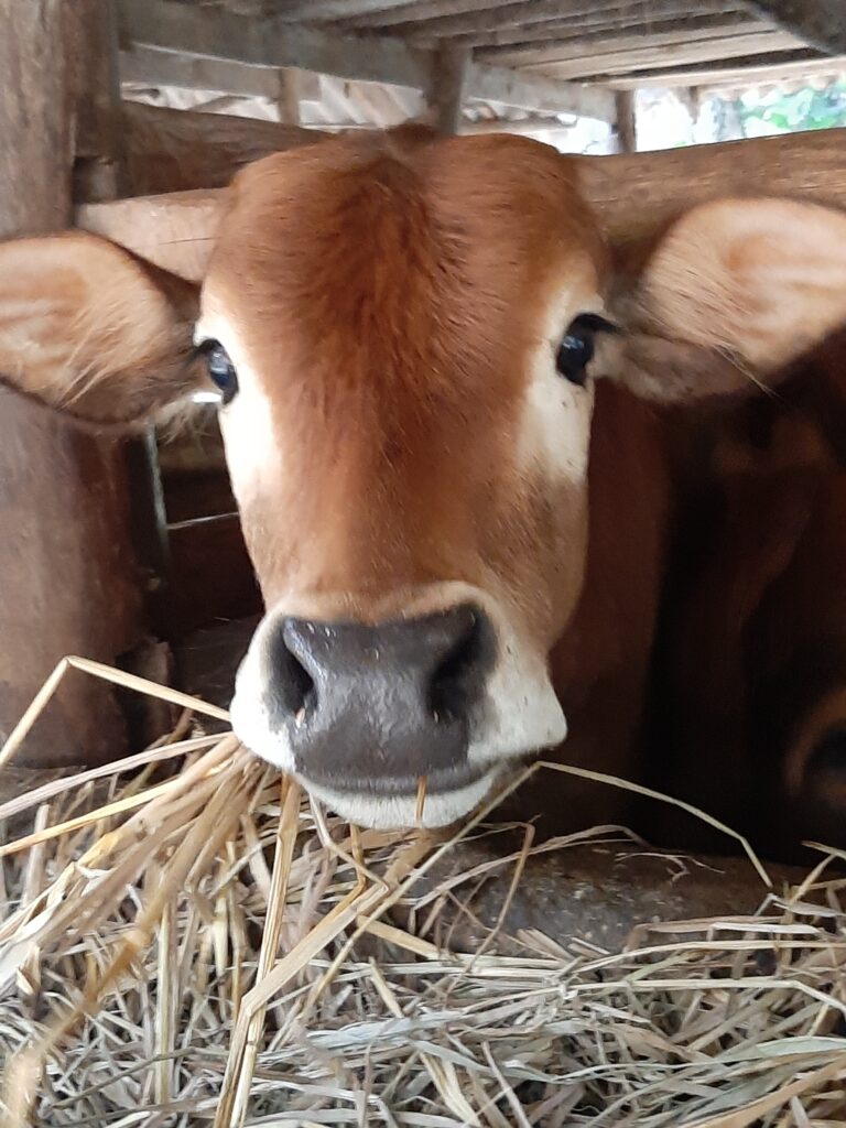 Our last day in the fresh green hills of Cao Bang. Early morning bike ride around took us along the river with morning clouds clinging to the steep hillside trees. We used the newly laid cement roads and riverside trails. I followed an old boy on a motorbike down a steep mud track and along a stream to a friendly family farmer who introduced us to their small herd of cows, reared for beef sales with nearby China. Its poor soil not good for crops. They’d bought the hillside for 3m VND ten years ago, created their trackway, houses and barn by extensive levelling.