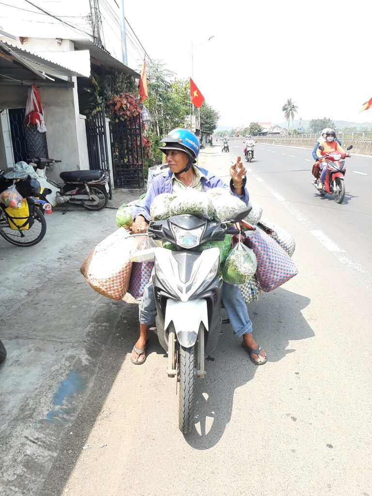 Sadly the coast road met up with a hot and hilly QL1a road with the mindless and moronic airhorns. By 12 noon my back was so hot I stopped at a roadside cafe and had a wonderful noodle salad lunch in the shade. As I left a man on an overladen mbike pulled in for a takeaway, sadly his electric starter did not work and he was unable to locate the kickstarter under the boxes and cabbages. Great fun the locals enjoy a good laugh.