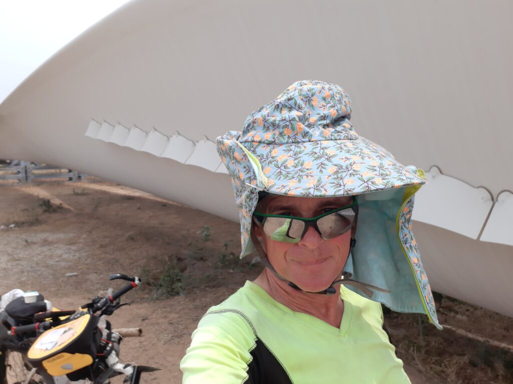 Top speed yet 57 plus kph a right Barry Sheen moment. The new hat develops a massive drag going downhill. Wind dead astern, when it’s a cross-wind the panniers and my sun helmet hat are real liabilities and I need to slow down or everything starts to wobble.